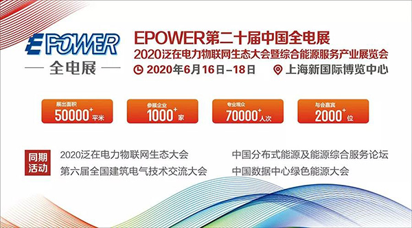 展会备注 “EPOWER全电展”聚焦电力与能源未来之道,定于2020年6月16日-18日在上海新国际博览中心举办“2020泛在电力物联网生态大会暨综合能源服务产业展览会”。 |
